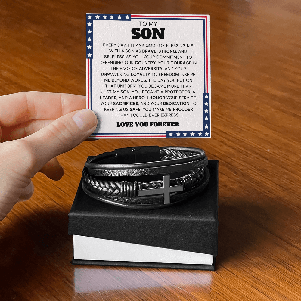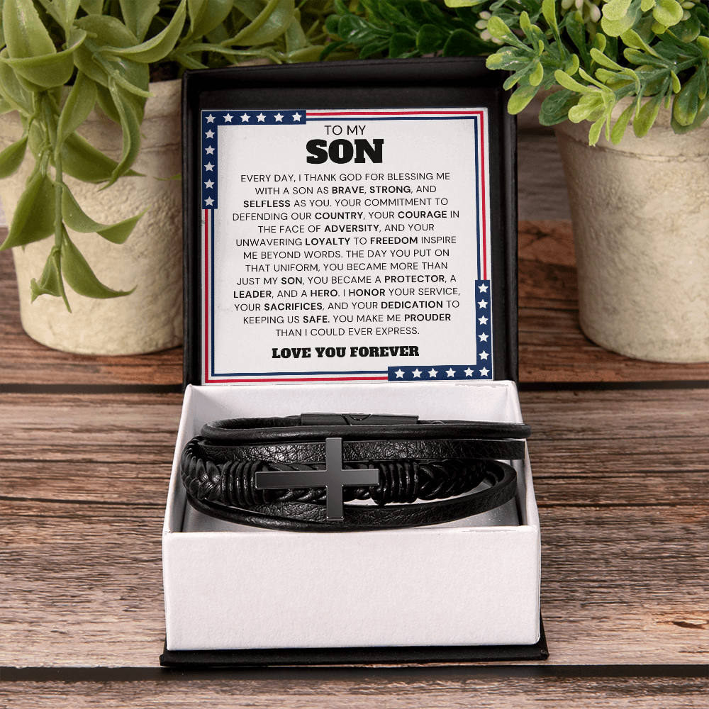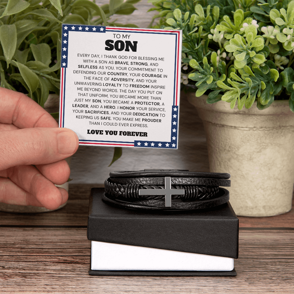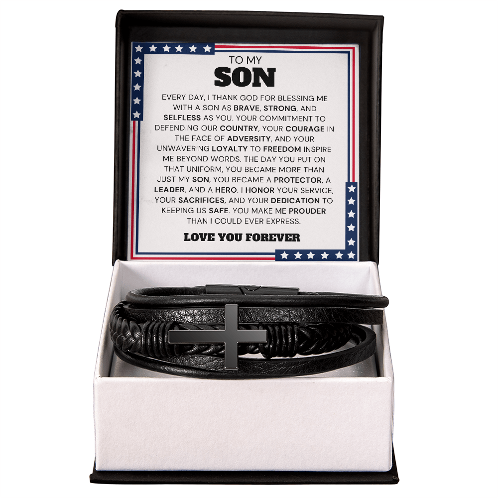 Message card: To My Son, Every day, I thank God for blessing me with a son as brave, strong, and selfless as you. Your commitment to defending our country, your courage in the face of adversity, and your unwavering loyalty to freedom inspire me beyond words. The day you put on that uniform, you became more than just my son, you became a protector, a leader, and a hero. I honor your service, your sacrifices, and your dedication to keeping us safe. You make me prouder than I could ever express. Love you forever.